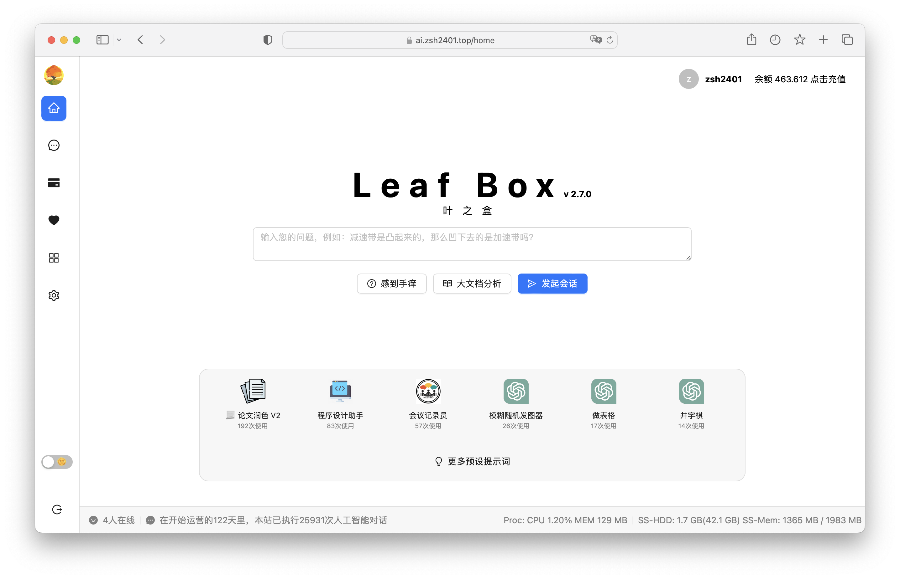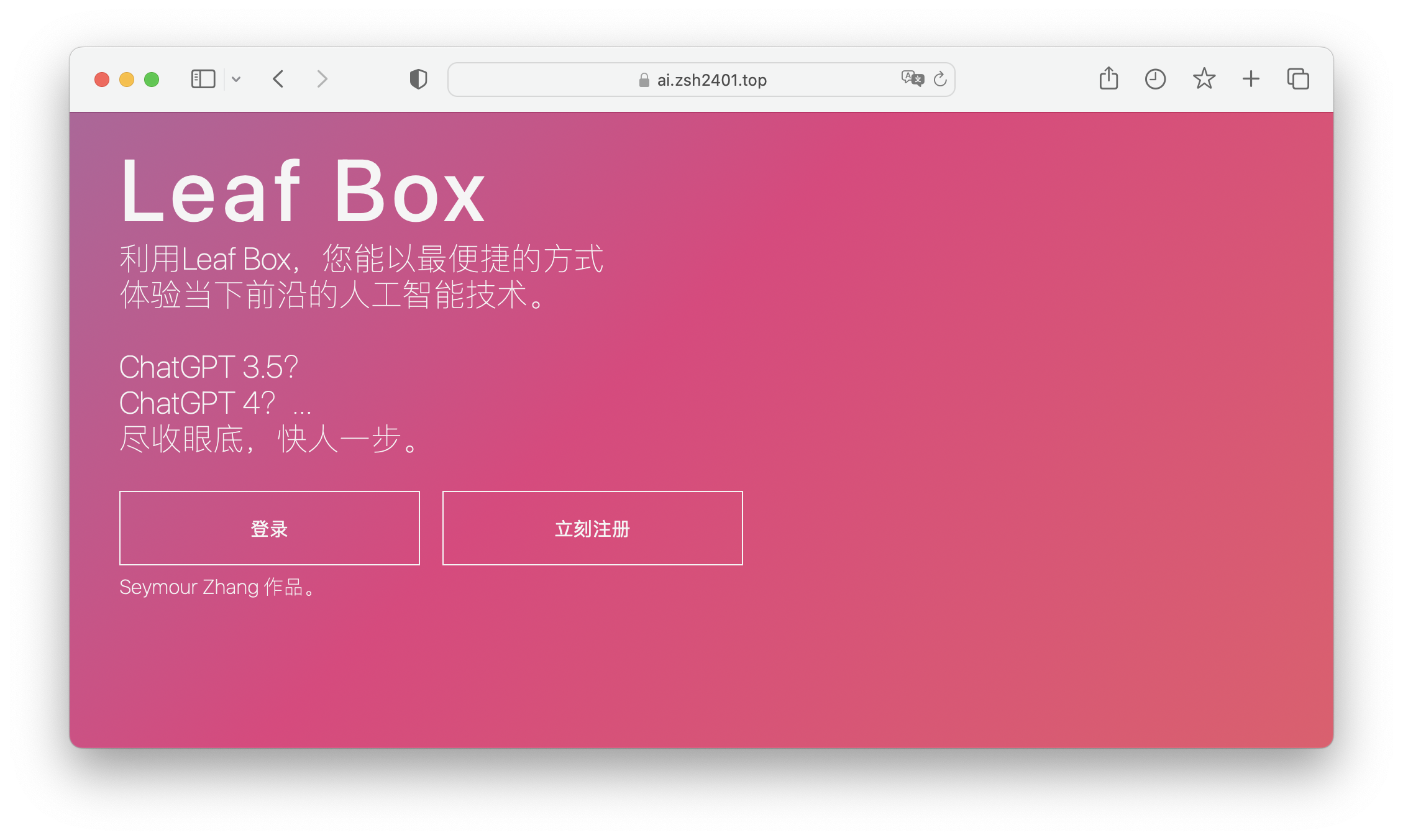 2023-06-16发表2023-06-16更新几秒读完 (大约69个字)0次访问Leaf Box来了没错,我套壳儿大神Seymour Zhang又来了,这次是ChatGPT!废话不多说,看链接:ai.zsh2401.top 如果您需要邀请码,请发送邮件到我的邮箱!zsh2401@163.com Leaf Box来了https://zsh2401.top/post/leafbox/作者zsh2401发布于2023-06-16更新于2023-06-16许可协议