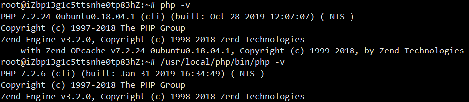 下图分别是php -v (/usr/bin/php)以及/usr/local/php/bin/php -v的执行结果,可以看出并不是一个版本。