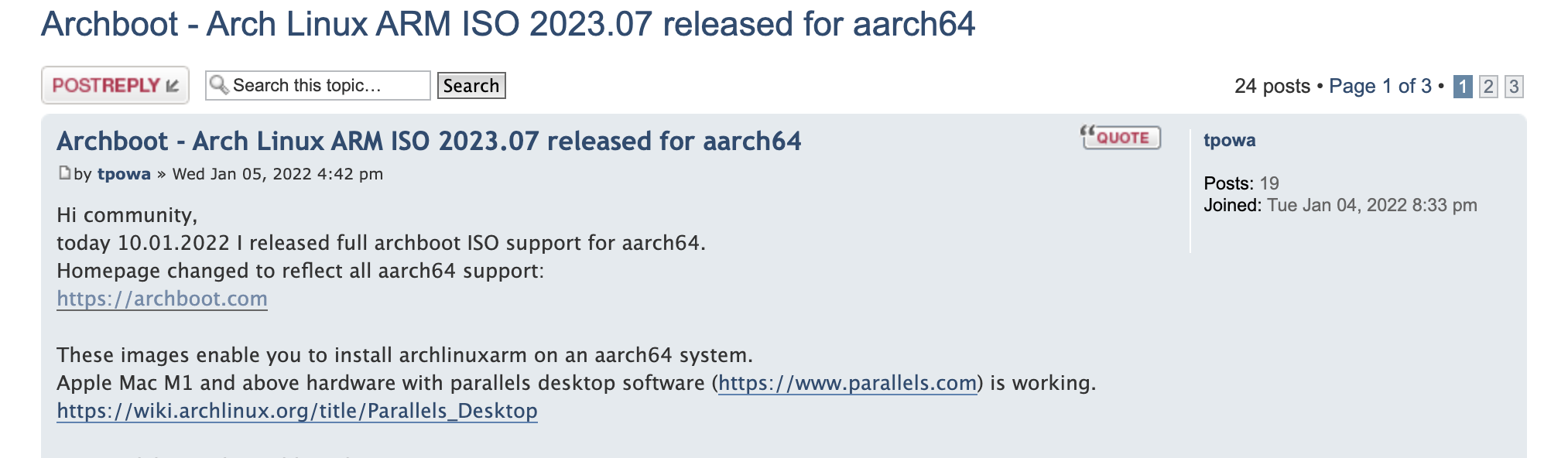 由于Apple方面不肯放出x86虚拟化相关的功能,Parallels Desktop与Virtual Box均不支持模拟x86架构。为此,我们考虑转向ArchLinux Arm。